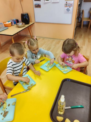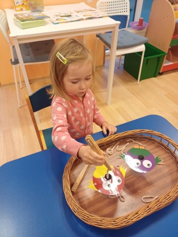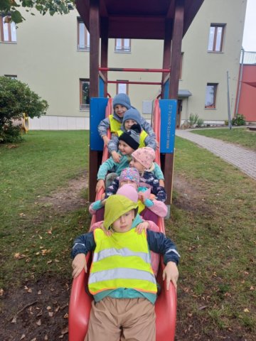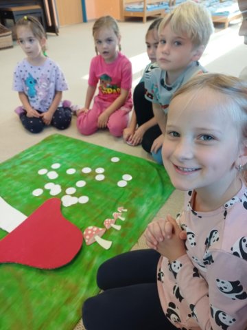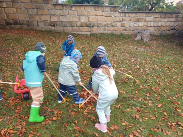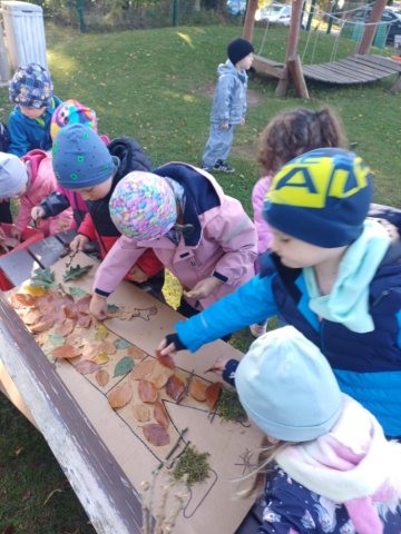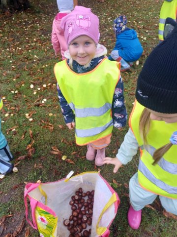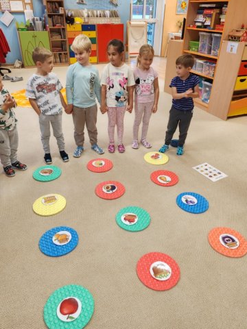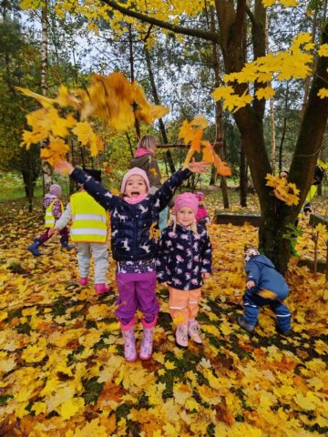 V říjnu děti poznávaly plody lesa, stromy, houby a povídali jsme si o počasí a odletu ptáků. Trávily jsme hodně času venku – v lese a na zahradě a pozorovaly proměny přírody, sbírali kaštany a uklízeli listí na zahradě. Z přírodnin jsme tvořili různé obrazce, malovali jsme barevný podzim a vyzkoušeli jsme různé pokusy. Děti se naučily ptačí tanec, písničku Hádaly se houby, u kterých si i zatancovaly. Divadélko Koloběžka k nám přijelo s pohádkou „Jak Vítek hledal vítr“. Celý měsíc byl ve znamení poznávání nových věcí kolem nás.