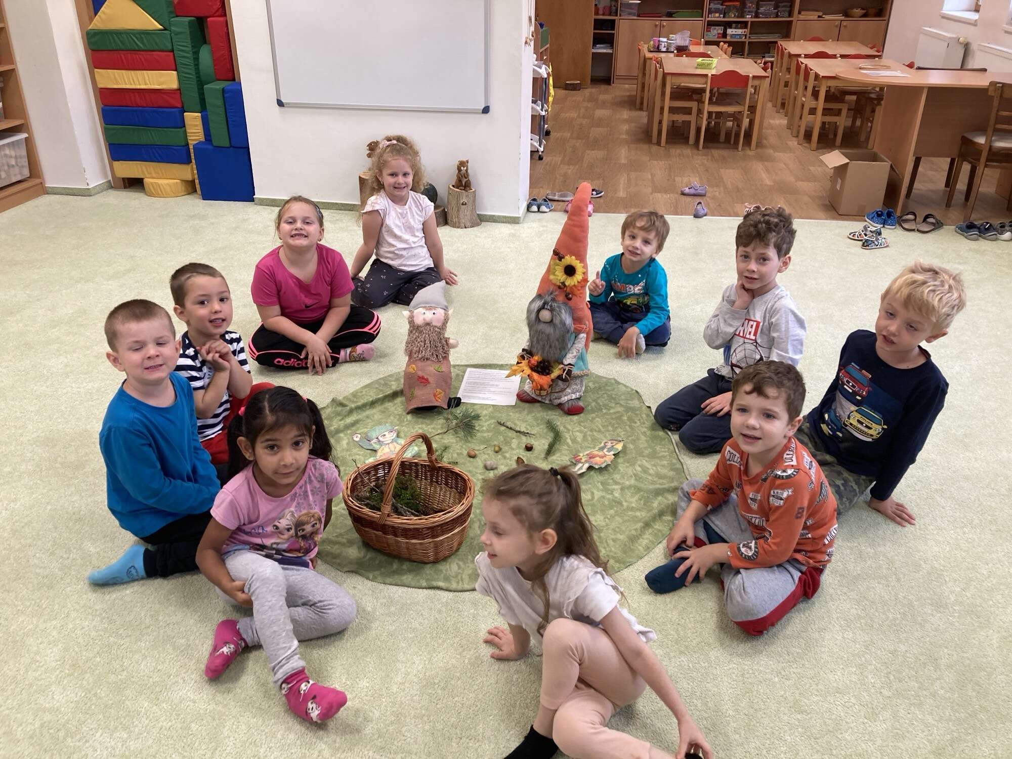 Celým měsícem nás provázel náš kamarád skřítek Boráček, který pro děti připravoval úkoly, hádanky i překvapení. Díky němu bylo poznávání podzimu ještě zábavnější a kouzelnější.