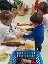 Abychom udrželi téma Velikonoc, přichystali jsme i tradiční velikonoční svačinku v podobě mazanců, beránků a ovocných vajíček. Po této dobré a vydatné svačince na děti čekala výtvarná dílnička a překážková dráha. Ve výtvarné dílničce si děti zdobily papírová vajíčka technikou papírové koláže a zajíčkova překážková dráha se skládala ze zaječího slalomu, prohazování zajíčkem, nošení vajíček na lžíci a sbírání žížalek pomocí kolíčků.