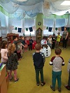 Na koberci byla pro jednu skupinku připravená překážková dráha – hod na cíl, přitahování na lavičce, prolézání tunelem a slalom mezi kužely. Mezitím druhá skupinka dětí byla u stolečků, kde si procvičovaly jemnou motoriku v podobě mačkání papírových koulí. Z nich potom každý vytvořil sněhuláka na kartonu, kterého si odvezl domů. Po vystřídání všech činností zbyla chvíle na společné hraní.