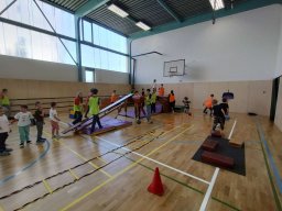 Dnes jsme s předškoláky navštívili ZŠ U Lesa. Bylo pro nás připraveno sportovní dopoledne. V tělocvičně byla připravena veliká překážková dráha! Děti se houpaly na provaze, skákaly na trampolíně, podlézaly překážky, přeskakovaly překážky, lezly dokonce do výšky po lavičce a přelézaly na druhý konec, trefovaly se florbalkou do brány, .... a mnoho dalšího. Na konci byly pro děti připravené medajle a potlesk.