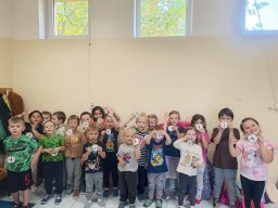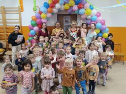 Další narozeninový den jsme si s dětmi uspořádali společnou svačinku v naší tělocvičně. Sešli jsme se celá školka (Čtyřlístek, Houbička, Jahůdka i Borůvka), společně jsme se najedli a společně si to užili.