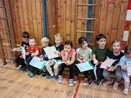 Základní škola náměstí Míru nás pozvala do velké tělocvičny na sportovní dopoledne, kde nás čekaly míče a koše, švédská bedna, duchna, žebřiny a lavička, skákací pytle, branky a další. Děti si tak vyzkoušely, jak se cvičí se školním nářadím i náčiním. Žáci základní školy se dětem věnovali tak, aby si každý všechno vyzkoušel. Nakonec odměnou byl nejen nový zážitek a trénování svalů pro zdraví, ale i papírový diplom a pitíčko.