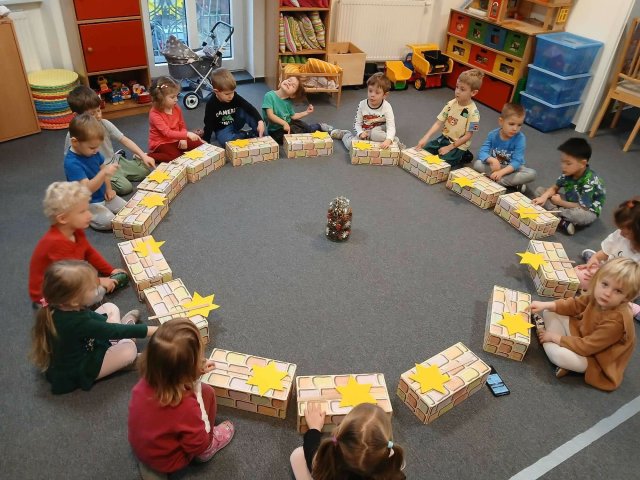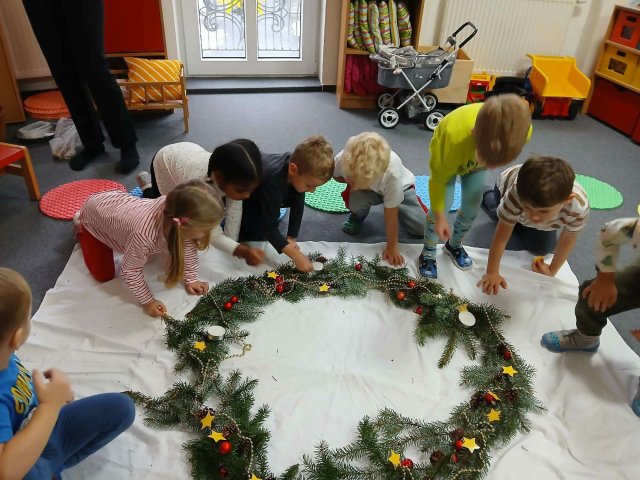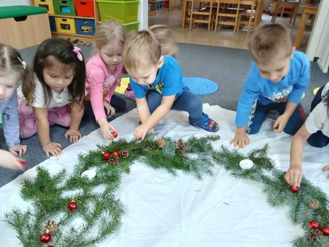 Postavili jsme si společně adventní věnec z větviček "zapalujeme" na něm svíčky - jednu vždy každý adventní týden. Zdobili jsme vánočně celou školku.