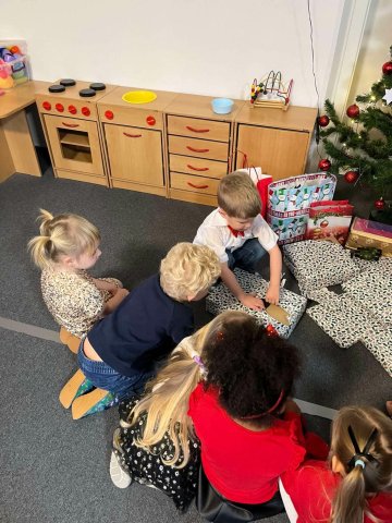 Děti si pod stromečkem na vánoční besídce vyzkoušely u rozbalování dárků.